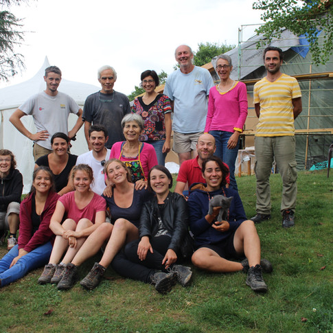 Charpente de l'extension et de son abris, création des caissons sous la toiture pour accueillir la ouate de cellulose, pose du frein-vapeur intérieur (l'intello, pour les intimes) pour fermer ces mêmes caissons, remplissage paille de l'ITE (les façades Est et Ouest de la partie existante), pose de l'Agepan (panneau de fibre de bois contreventant) sur la façade Ouest et le haut de la façade Est (qui sera support du bardage en douglas), et mortier GREB sur la partie basse de la façade Est (qui sera enduite de chaux-sable), barbottine sur les murs intérieurs et son corps d'enduit avec ses trames, confection d'un poulailler pour nos 3 dernières mascottes (et Maël, le plus jeune du chantier, a maintenant le sourire!). Le tout avec une équipe super motivée, dynamique, joyeuse et efficace !